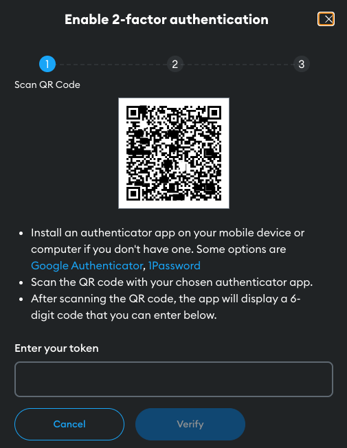Scan the QR code with your authenticator, and enter the initial six-digit token. Select Verify to proceed.